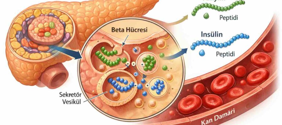 Adının “amiloid” içermesi yanıltıcı olabilir. Evet, Tip 2 diyabetli hastalarda pankreas adacıklarındaki anormal amylin birikmesi (amiloid plaklarının oluşumu) bir komplikasyon olarak görülür. Ama sağlıklı bir bedende amylin, tam tersine kritik bir düzenleyici hormondur — özellikle yemek sonrası tokluk kontrolünde.