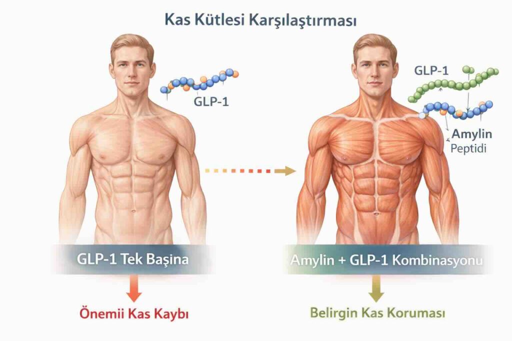 Her ikisi de tokluk sağlar; ancak farklı organlarda üretilir ve farklı beyin yolaklarını kullanır. En kritik fark kas kaybı konusundadır: GLP-1 ilaçlarında kilo kaybının %30–40’ı kas dokusundan gelirken, amylin analogları kas kütlesini çok daha iyi korur. Bu nedenle ikisinin kombinasyonu, tek başına kullanımdan üstündür.