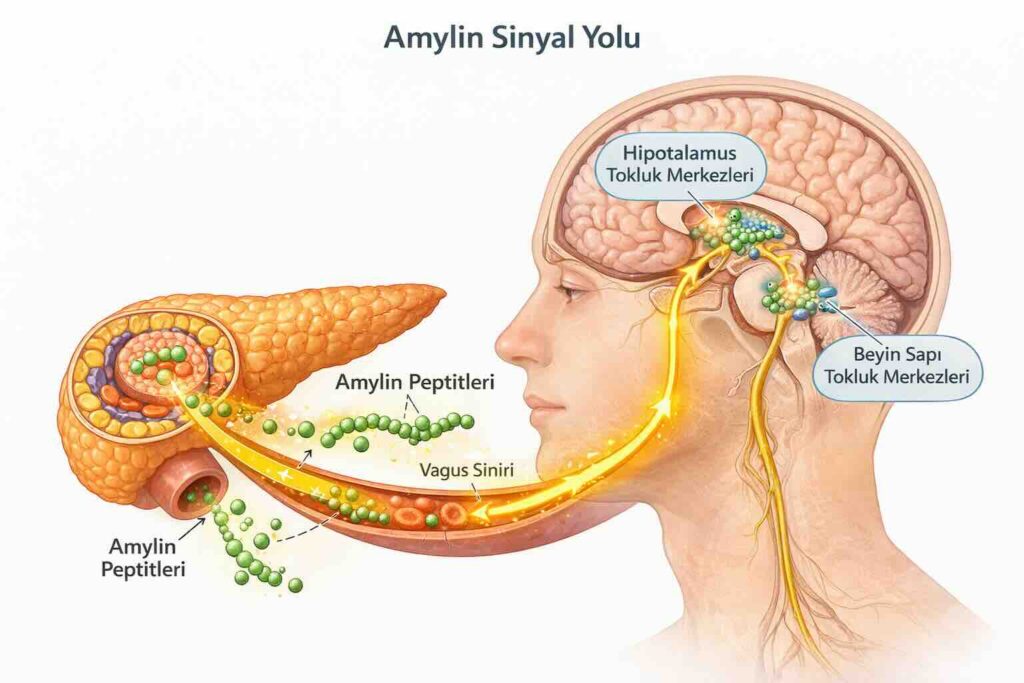 Önemli bir nokta: amylin, sadece tokluk değil leptin duyarlılığını da artırır. Obez bireylerde sık görülen “leptin direnci” — yani yağ dokusunun salgıladığı tokluk hormonunun beyne ulaşamaması — amylin sinyalizasyonu ile kısmen aşılabilmektedir.