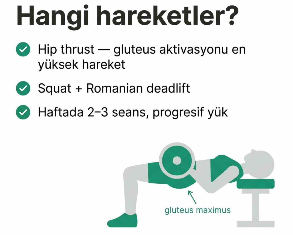 Haftada en az 2–3 gün direnç (ağırlık) antrenmanı, kas protein sentezini uyarmanın en etkili yoludur. Squat, deadlift, bench press, sırt egzersizleri ve omuz hareketleri büyük kas gruplarını hedefler. Yürüyüş gibi aerobik egzersizler genel sağlığı destekler; ancak tek başına kas kütlesini korumak için yeterli değildir.